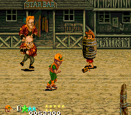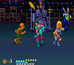 The five levels are standard arcade-fare for the time – the first level is set on the streets, before you take to the subway, a casino, a construction site, and the Wild West. What aren’t standard are some of the enemy designs, which range from the bizarre to the offensive. As well as standard thugs, you’ll fight clown robots and dominatrices before punching a tramp, who burrows into the ground and turns into a Cossack dancing Chippendale. There are fire-breathing punks, roller skating hockey players, and baseball bat-wielding thugs on unicycles. DJ Boy features good use of background elements, with enemies throwing obstacles and bombs onto the ground to damage you. In the first level, it’s dynamite from a moving tram, with extra thugs also leaping onto the street. In the subway level, child thugs throw suitcases from the top of the train, and then swing down the poles to join the fight. Piles of coins try to knock you down during the casino stage and enemies hide in barrels during the Wild West level, throwing even more dynamite at you. At one point you fight a hair metal band while the drummer flings cymbals in your direction.