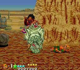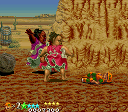 The game drew criticism for one of the bosses, a large black lady named Big Mama (resembling Mammy/Blackface stereotypes) who frequently falls over, exposes her pantyhose, and passes gas. In the later Japanese Genesis port, the fart is used as an attack. This would not be the last time Kaneko courted controversy, as the later Gal Panic series tasked you with stripping women of their clothes.
