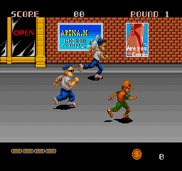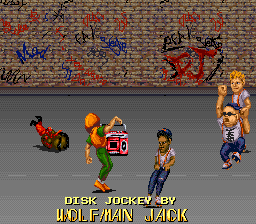 The intro features digitized speech by Japanese musician Demon Kogure in the Japanese release, and American DJ Wolfman Jack for the rest of the world. The odd thing is that the game has an image of Demon Kogure on the title screen, but they didn’t change him for the US release, so non-Japanese players wouldn’t have any idea who it was (it certainly wasn’t Wolfman Jack, despite what the text says). The music is upbeat and funky, but disappointingly not in keeping with the hip-hop theme.