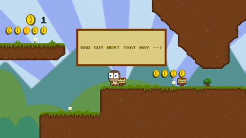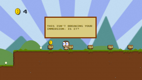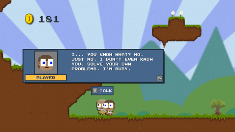 Which makes the expansion all the better. The game seems to actively make fun of itself here, such as having a character who makes a lame videogame references and draws the ire of the player character. It also finally brings in some truly unexpected developments into the tale, giving a fantastic punchline to a joke started in the first story, plus some genuinely good moments of game design. Most of DLC Quest is spent gathering coins in simply made levels with basic platforming controls, almost as dull as the games it cast shade on, but that added expansion gives just enough variety to make it entertaining.