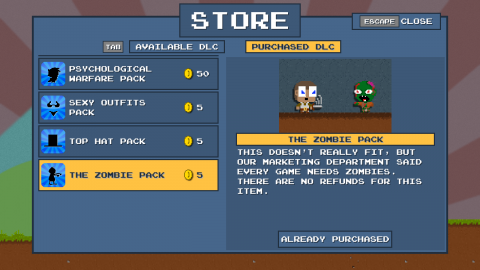 The concept is simple. You’re a random videogame protagonist with no discernible features besides being the guy who has to be the hero. A princess is kidnapped by a bad guy, you go and stop him. Problem: You start the game with no jump or animation. This is where the merchant comes in, a man who offers you DLC packs that add features to the game itself and the hero’s moveset. In order to make any significant progress in this game, you have to keep using money gathered via gold coins in the world to buy more DLC packs, up until you finally defeat the bad guy. The Live Freemium or Die expansion continues from the last story with a new scenario that has various NPCs killed by strange creatures, but the story ends up shifting in a direct confrontation with the real evil: Exploitative market strategies!
