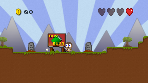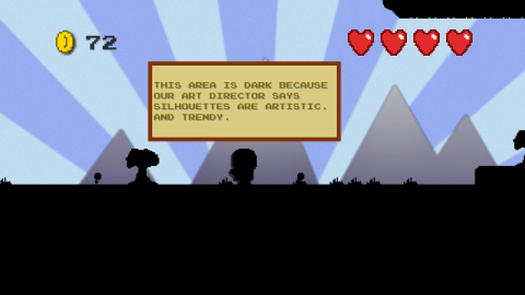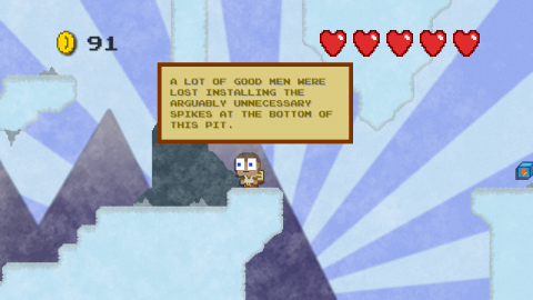 The expansion adds a wall jump ability, and a few spots that make good use of it and requires some level of mastery. I mean, it’s no Mega Man X, but it actually starts to be engaging mechanically and not just in humor. The NPCs get more great lines, especially the merchant, and jokes are better spread out. The entire expansion feels much tighter, with no excess weight and just enough room to chuck in a few more jokes to keep the humor going. All the game developer signs left lying around may be my favorite gags, especially one found in an empty area that simply reads “Allan please add world.” The final boss fight (and only boss fight) makes good use of the game’s mechanics and has a clever style to it, and it caps off with the perfect joke for this farce. I dare not spoil it, but it made up almost entirely for the weak first story.