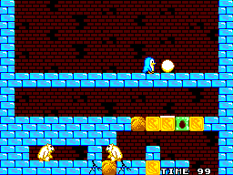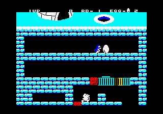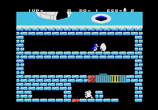 The mechanics are just the same as the Space Adventure on Master System, with only a few exceptions. There are two new powerups that can be found hidden inside the walls: a pair of wings that improves the penguin’s jumping abilities and a steel eggshell that makes the freight temporarily indestructible. The eagles and ghosts are missing, leaving the bears as the sole antagonists this time.