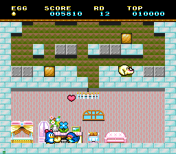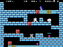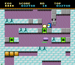 Unfortunately, the limited screen size and resolution make the Game Boy version the most frustrating of them all. One can barely see below the safe falling range of the egg, and while the penguin has the power to scroll the screen horizontally, the bottom of the screen is always dangerously close, making the undertaking much harder than it used to be. The game doesn’t even show the stage beforehand, like it did on the SG-1000. At least it is the first in the series to allow a selection of music. Two of the three tunes are even quite pleasant to listen to, other than the forgettable to annoying music that played throughout all of the console versions so far.