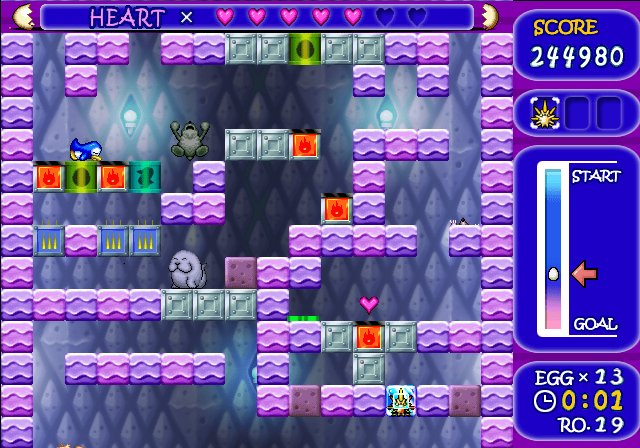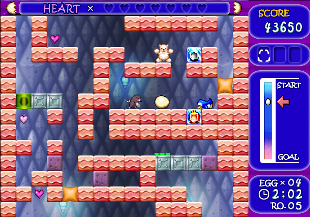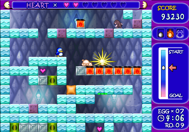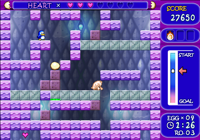 Other than the old games, though, this remake doesn’t blow its load all at once. New elements keep being introduced for the first dozen stages, making for a much more exciting game. There is a new display that shows how much of a stage has been conquered so far, as well as a heart counter, which – once again – is only there for scoring. The final new display shows three slots of extra weapons. These include a flame that burns all obstacles immediately surrounding the egg, the return of the steel eggshell from the Mega Drive version (although it only breaks one fall now), and a set of spikes that can be used to ward off attackers should Adelie not be able to make it back in time.