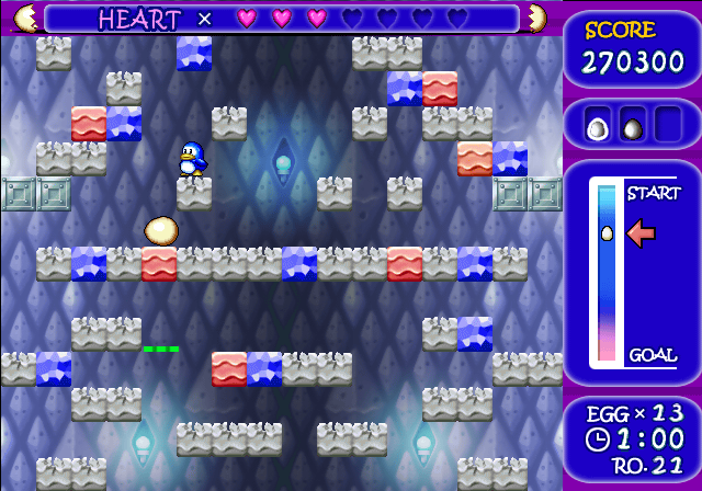 The trick to each obstacle is usually smart digging to create a viable way for the egg, using rocks as possible platforms to catch its fall. There are also solid floors that can’t be dug through. Most of them have trap doors where the penguin can drop his egg, but he has to find another way for himself, potentially putting it in danger. There are also hearts floating around the levels, but they’re merely for scorekeeping. The penguin can’t technically die, and only stays incapacitated for a couple of seconds after getting hit. Only the loss of an egg forces a level restart.