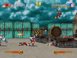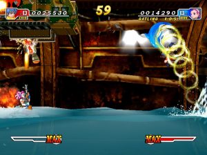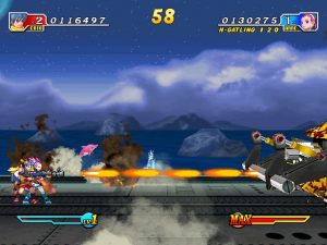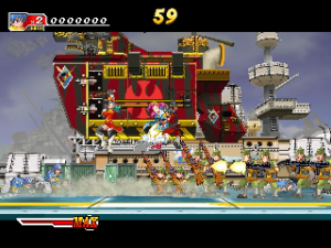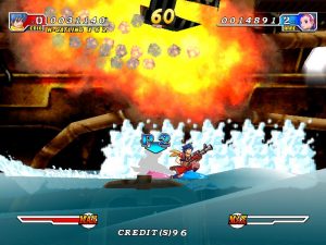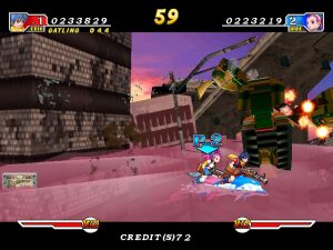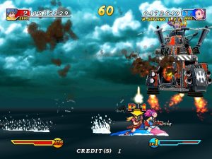 The world of Dolphin Blue takes on the look of a city devastated by war and immersed in water. Once vibrant Japanese towns are now in shambles with nary a civilian in sight. Warships roam rampant over the new oceans. The players and enemies are drawn with sprites, while the backgrounds and larger vehicles are modeled with polygons. It’s similar to Capcom’s Strider 2 from a few years prior, though it looks much cleaner thanks to the arcade board’s higher resolution. The style is also reminiscent of Hard Corps: Uprising by Konami, which was released several years down the road. The characters are drawn in a bright anime style and are quite well animated, consisting of many little touches, like the diver enemy’s suits inflating when you shoot them. The polygons have that certain classic Naomi charm, where they’re not as shimmering as the PlayStation or blurry as the Nintendo 64, but still simple enough to be considered low-poly (although the water effects do look a bit antiquated). There are a number of cool details throughout, like your dolphins appearing far in the background as you fight on land. Many of the levels have you chasing the enemies as they escort the kidnapped princess to their base, giving a sense of urgency to the action. Though many of the bosses ride assorted vehicles and machinations, they’re introduced by portrait at the beginning of the stage, giving the game some extra personality.