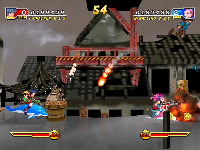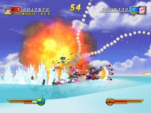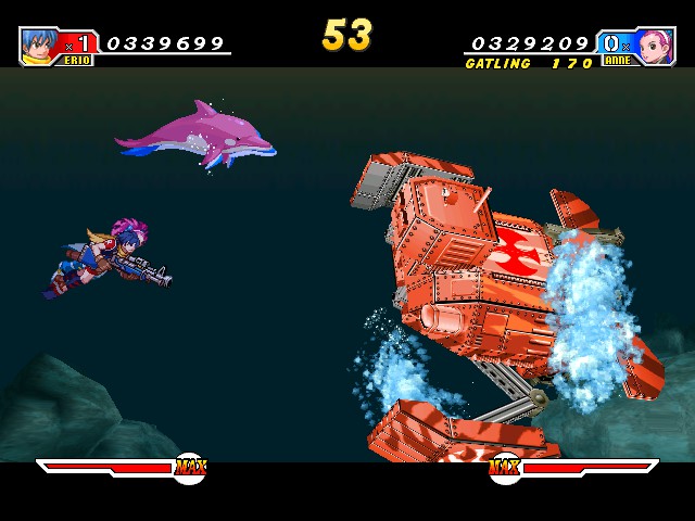 You play as one of two characters – Eiro, an arms dealer who is looking for some action, or Ann, a soldier who is out to protect the local kingdom. Each of them also have their own pet dolphins, which are blue and pink, respectively. The game is set in the future, and a major incident has transformed what used to be a peaceful nation into a troubled land of waste and ruin, damaging the Earth’s surface and immersing most everything underwater. The heroes have to protect the Earth’s remains from an evil empire that wants to take over the world, and rescue a princess figure in the process. The premise was almost definitely inspired by Waterworld, a movie released a decade earlier.