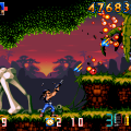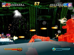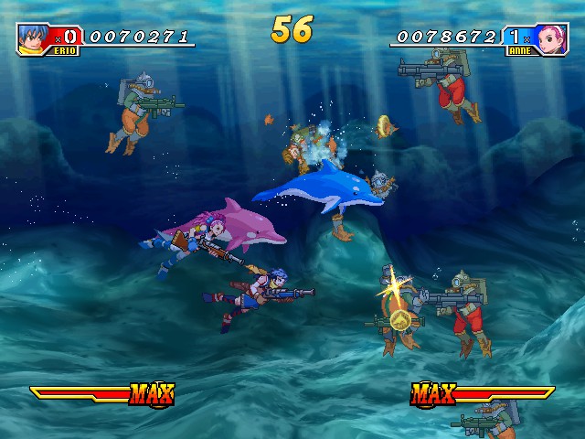 Dolphin Blue‘s five stages are divided over three different styles of gameplay – on land, over the water, and underwater. The land sections are the most reminiscent of games such as Metal Slug. The above water sections are auto-scrolling as players ride their dolphin above the waves, and are similar to the vehicle stages in Contra. And the underwater sections are much slower and similar to horizontal shoot-em-ups. Enemies range from standard ground troops to armored tanks and even battleships and dropships. There are extra weapons too, with limited ammo, including Gatling guns, heavy Gatling guns, two different types of missiles, and a gun called the “melt gun” that shoots flares like a machine gun. Like Metal Slug, you can also stab enemies if they get close enough.