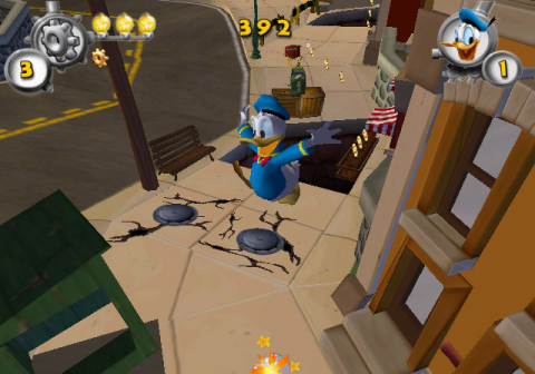 The game consists of four overworlds which contains four standard levels to choose from, making a standard play through 16 levels long. Before accessing them, Donald finds himself in Gyro’s lab, which acts as the main hub of the game, allowing players to save their games and such. The worlds takes place through dour distinctly different terrains, with a forest area, downtown Duckburg, Magica De Spell’s manor and last Merlock’s temple being the ones to choose from. Goin’ Qu@ckers features three different styles of gaming. Each of the four levels on each world is split into two types, 3D and 2D platforming. Two of the levels are 3D where Donald runs inwards the screen jumping over hinders and navigating through an open though narrow 3D space, which hosts a number of secrets and other items for him to find before reaching the end. These stages are extremely similar to the ones found in Crash Bandicoot. The 2D stages are played like the standard platformer, running left to right with the camera being locked on a side view. Both styles feature the same kind of obstacles, making use of the double jump to cross large gaps or land on moving platforms. The 3rd style is the boss battles, which all are unique and requires different strategies from one another. On each level there are stars that can be collected for 1-ups once a 100 is collected.