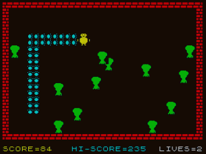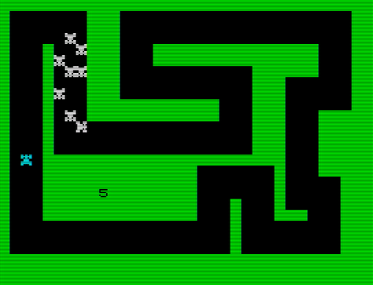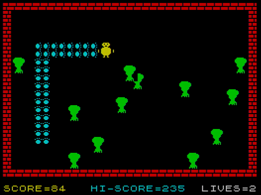 The best is Weasel Willy, which is a bit like Snake, and a great example of why randomisation is bad. Instead of collecting things you avoid randomly placed trees and your tail never disappears; touch the paws left by the rotund weasel, any tree or the outside walls and you die. Progressing to the next level is entirely random (it just suddenly happens for no reason whatsoever). Subsequent levels increase the number of trees and, thanks to their random placement, you can start off in an unwinnable situation. Perhaps it’s attempting to teach kids a valuable life lesson?