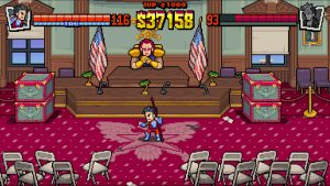 This is where the main replay factor comes from, because all of the characters feature distinct movesets and abilities (although some do share move types; for instance, Burnov features similar grab moves to Abobo, but has a move where he spins enemies around instead of pounding the ground). Giving players the chance to unlock and play as former foes from across the series’ history is a brilliant move, as they are all distinct enough that every player will have different preferences. Players can even adjust various difficulty settings to yield more or less tokens per set amount of gold; generally, the easier you make it, the less tokens you’ll get, while the opposite is also true. It’s a brilliant way to encourage players to test their own limits and gives them control over the pacing of the content they unlock.