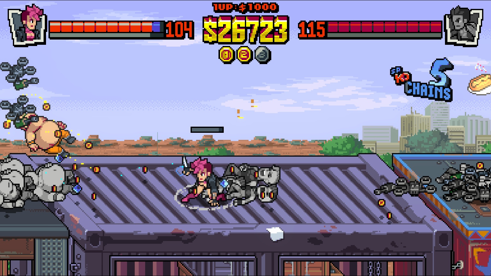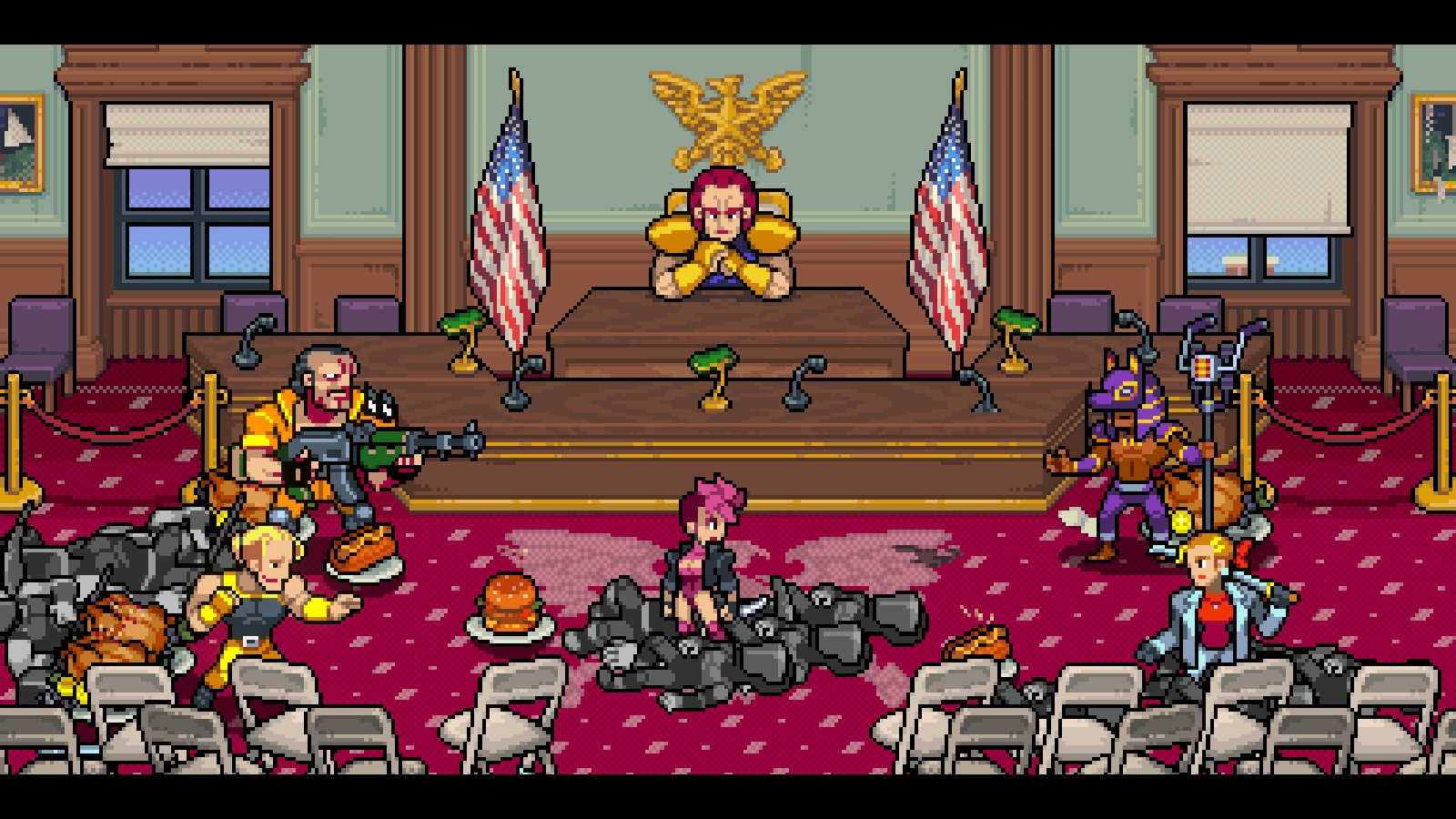 The game’s true ace in the hole is its generous suite of unlockables. See, rather than just shooting for a high score, players earn cash in game. It can’t do much besides purchase upgrades between levels and revive your characters if you die, but all the money you get is converted into tokens you can spend on a variety of extras on the main menu. This includes stuff like music tracks, concept art, level art, gameplay hints and, most importantly, a wide variety of unlockable characters. There are a whopping twenty characters currently available to play as, which includes all of the mini bosses and main bosses (you can even play as the Mayor, which lets you use the ridiculously powerful moves that plague your end game experience back against the enemy – given his design, he almost feels like a beat-em-up version of Ganondorf).