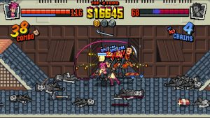 It’s a unique way to have the player progress through the game, and helps add to the game’s inherent replay value. You’ll need to play through the hour and a half long story multiple times to see every fight and level. And while this is marketed as a rogue like, the levels sadly don’t change much per playthrough, just the order you go through them in. Enemy placements are mostly the same, too. But the game does have some tricks up its sleeve to alleviate any repetition a player may feel. For one, you are able to purchase permanent buffs between levels; these can run the gamut, from simply giving you more health, to making your special move bar refill for every “Crowd Control” (three or more kills) you get with special moves. It’s a lot of fun to upgrade your character as you see fit, and for most players, your character will be far more capable during the final level than they were at the beginning.