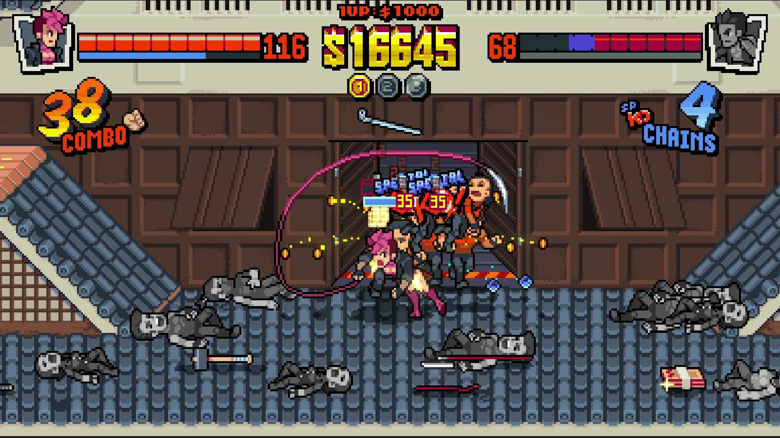 Double Dragon Gaiden was developed by indie group Secret Base, who previously worked on the rather fun Streets of Red: Devil’s Dare Deluxe, which was in and of itself a throwback to arcade beat-em-ups of the past. That game introduced an interesting risk/ reward system; you have a special move bar that refills slowly over time, and if you’re able to kill at least three enemies with a special move, the game would reward you with a healing item. Four and five kill moves would increase the amount of health given back. As it turns out, this was a prototype for Gaiden, where Secret Base would refine their in-house style to deliver an accessible but quite deep beat-em-up rogue lite experience.