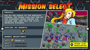 This isn’t the only major choice the player will face, though. This game has a unique level progression system. Players can tackle the bosses in whatever order they wish, but the catch is that the difficulty of the next level increases. For instance, if you face Lady Okada first, you will have to fight through one level before facing down with the katana wielding warrior. But then the next area will require you to fight through two levels before facing the boss. The third will require three levels, and whatever your fourth option is will have you go through three levels and face a much tougher version of the boss at the end. Machine Gun Willy will have an attack chopper to help him, for instance, or Duke will have powerful robot attack dogs you must deal with.