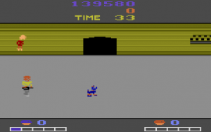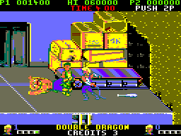 Somehow the Atari 2600 experienced a small revival in the latter half of the eighties, and so a version of Double Dragon found its way on the system, courtesy of Activision. Suffice to say, it’s completely inadequate, but boy did they try. It already surprises with the optional versus mode, where two players get to fight against each other. All the enemies are in there, even though most of them are hardly recognizable as human characters. Platforming was removed entirely, and only four attacks remain in the game (punch, kick, elbow and jump kick), but the combatants can fight with sticks, throw knives, and even toss a crate around, which is more weaponry than any of the C64 versions offered.