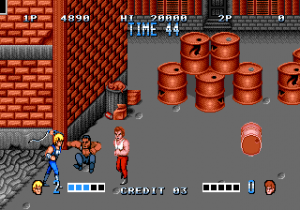 It’s not like Billy and Jimmy entirely reject weapons, though. They’re eager to pick up and put to use whatever arms their adversaries may drop, from bats and whips to dynamite and throwing knives. Especially the latter deal a large amount of damage, but can be kicked out of the air with the right timing. There is also heavier stuff lying around the scenery, like oil drums, crates, and rocks, which stand ready for the taking by either side of the battle, and even can be kicked around so you don’t need to lose your current weapon to make use of them. Some of the weapons are really strong, and there is no limitation to their use as long as you can keep them on screen, but a single hit is enough to make you drop them, and it’s easy to mess up your game by making yourself a target as you try to pick them up again.