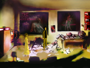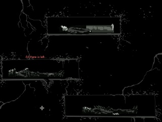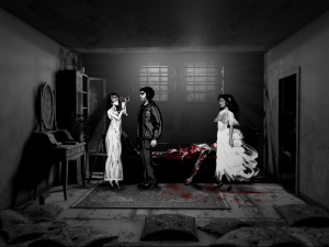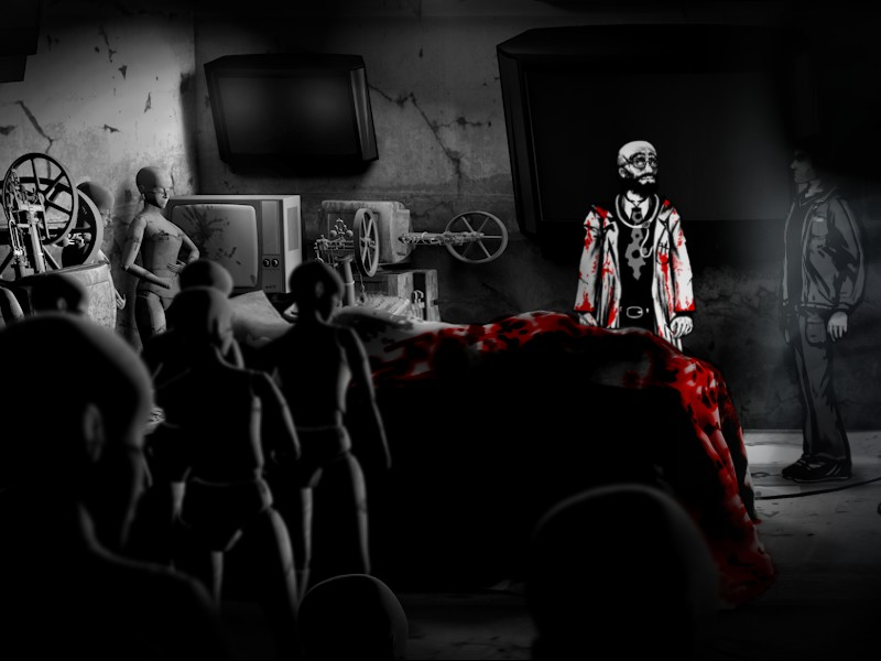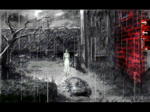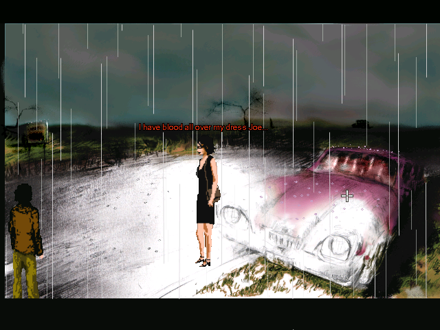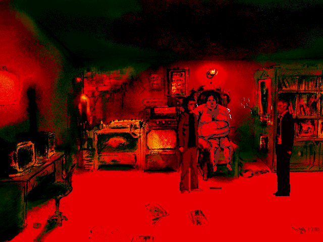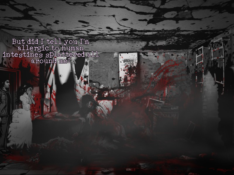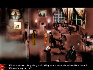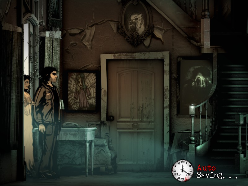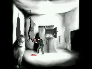 The graphics are gorgeous, mostly black-and-white with splashes of Dario Argento color. Animations are limited, yet polished enough to be acceptable. Some 3D effects are incorporated into the game as well with varying degrees of necessity and success. They are too inconsistently placed. A transition scene when Joe climbs down into the basement, for instance, is the only 3D transition in the game. It isn’t bad, but it really wasn’t needed. The introduction FMV, which guides the player through the increasingly demented rooms of Quiet Haven Hotel, is decent, but much better suited to a trailer than placed in-game. The paintings which coat the walls of the hotel, drawn by artist Victim of Reality, are meanwhile delightfully eerie additions to the hotel’s already-horrific confines.