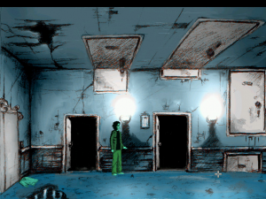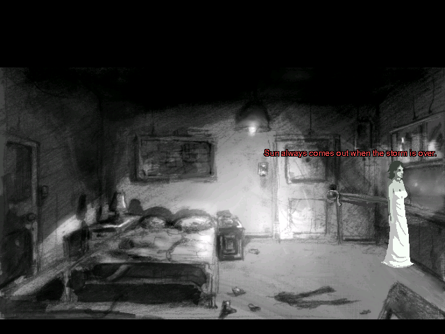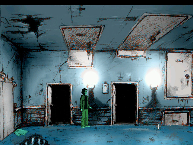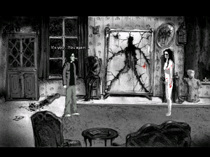 Graphically Downfall exceeds expectations. It has a sense of gritty style all its own, intermittently fading from color to black-and-white and splotched with blood. The look of the Quiet Haven Hotel is influenced by the nursing home Michalski worked at during the game’s creation. Not so much the blood and guts, but more so the sense of unease and disquiet, like something is making noises you can’t explain, the knowledge that dozens of people have died here keeping you on edge. The hand-drawn, low res (640×480, 32-bit) graphical style is lovely to behold. It has a skewed retro feel, in that essentially the style is reminiscent of old adventure games, but there are things happening on screen that would never happen in old adventure games.