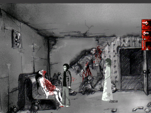 Character designs are solid. They look like the characters one might find in a 2D Silent Hill. They are regrettably marred by choppy animation. (And doesn’t Ivy look way too much like she’s wearing a masquerade mask? Intentional?) But one must make allowances for minor flaws in independent games and this is one of them. Every character has a distinct appearance. Even the minor roles drip with personality, like the crazed neo-Nazi Doctor Z or the seductress hotel receptionist (whose corpse you discover hanging from the ceiling in her room). The cast is small but effective. The cadavers and monsters are wonderfully horrifying. While sometimes absurd, they never detract from the game’s overall style and atmosphere.