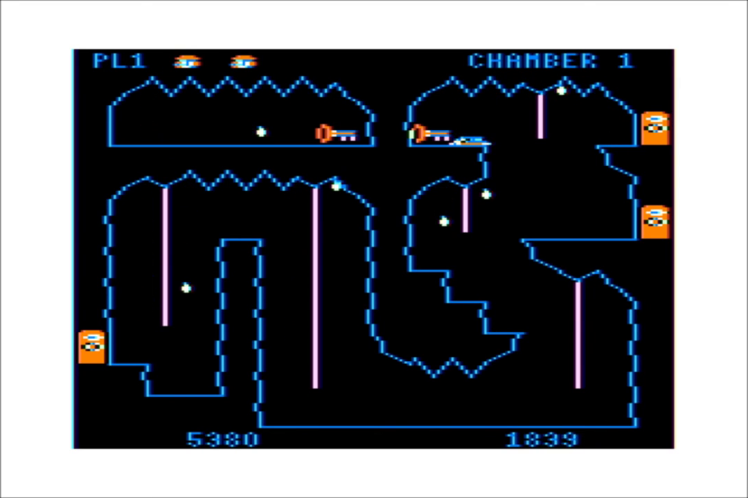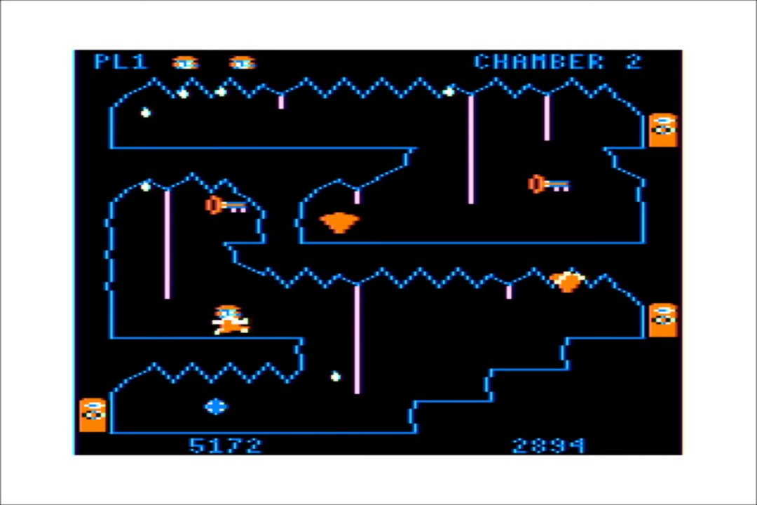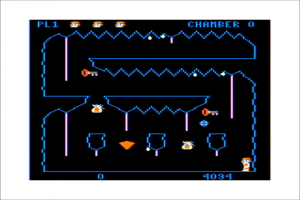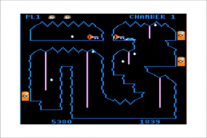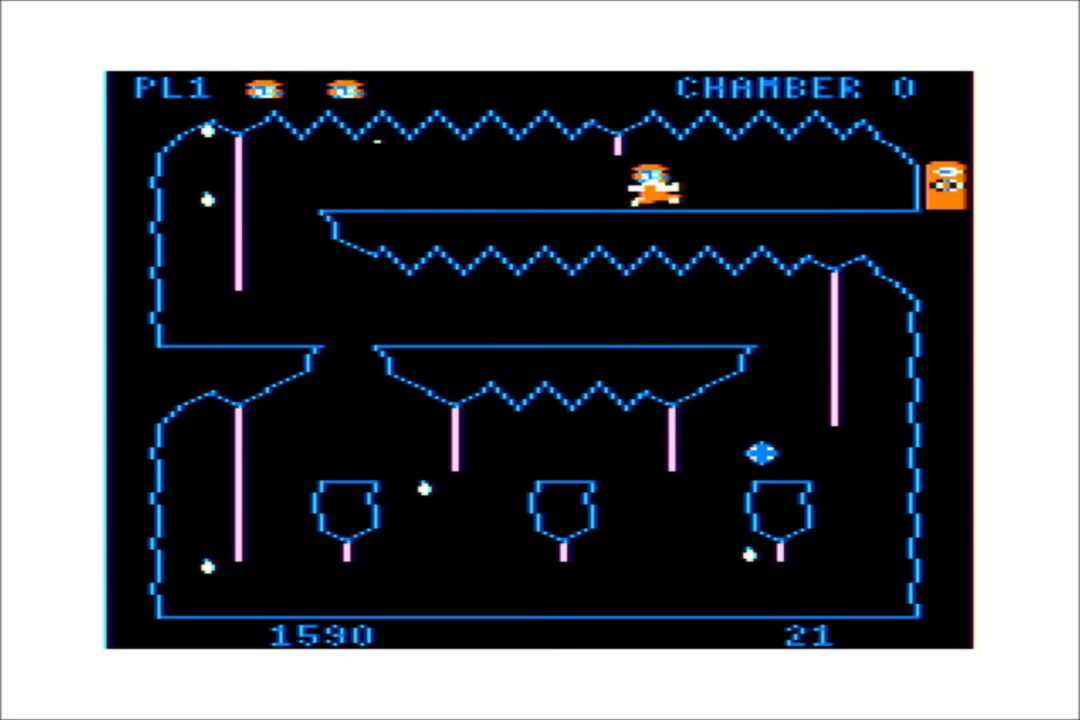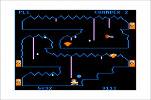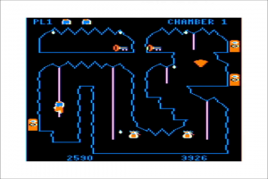 The most obvious hazards to avoid are the bouncing blue boulders and the acid drops constantly raining from the ceilings. One hit from any of these, and you’re dead. Each cavern has a time limit as well. Failing to escape a cavern before the time runs out isn’t a death sentence, but it might as well be, because once the time runs out, the bats come out (one per cavern). They dart around the screen in diagonal patterns, and must be avoided at all costs.