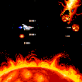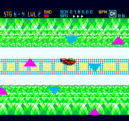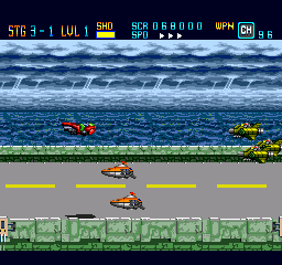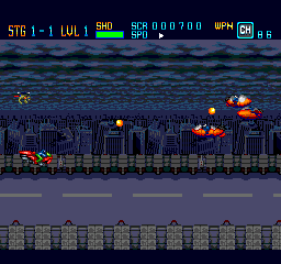 At the start of each stage you are presented with a weapons load-out selection, as well as a short summary of the current story and a password. You have one main gun that fires rapid-fire and has unlimited ammo, and one secondary weapon with limited ammo that you need to replenish with an ammo pick-up. There are two main weapons to choose from that can each be updated from level 1 to 5 (indicated in the HUD) by collecting a certain power-up: The Beam Valcan [sic.] shoots bullets at a fast pace and becomes a spread shot after one update; the Laser Cannon fires long lasers that penetrate enemies, but is a bit slower than the Beam Valcan, even after you update it. The higher the level of the main weapon, the more simultaneous directions it will fire. The secondary weapons are really useful and add a well-needed extra punch to your firepower. The Chaser is a homing missile that mostly does a good job at seeking out the nearest enemy or bullet (but can have some trouble in enclosed spaces). You can carry up to 96 missiles, which makes them a great addition to your main weapon. The Crusher is basically a screen-clearing bomb, but you can only have up to six at a time. The Barrier is a shield that you can place in any of the four directions around your bike to protect you from incoming bullets. Pressing the button changes the shield’s position one step clockwise, meaning that you can easily adapt it to each situation. The Barrier shield is always activated, and the 15 shields that you can carry are effectively its hit points: when they reach zero, you lose the barrier. The choice of the different main and secondary weapons is a welcome feature and lends itself to some nice gameplay customization.