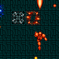 The Motoloader bike has a health bar and you can take four hits before you die. The three top hit points are indicated by a colored bar, but when you get down to your last, it blatantly says “Panic!” (which should maybe not be taken as advice…). When you get hit, the level of your main weapon downgrades one step. You can touch walls without getting hurt, which helps the navigation of the more narrow areas tremendously. There are five different power-ups to collect: the aforementioned main weapon level-up item and the ammo for the secondary weapon, a hit point restoration capsule, a screen-clearing bomb and an invincibility device. Sadly, it is very difficult to see which power-up is which, since they all look very similar and there are a lot of bullets to dodge that pull your attention elsewhere. The second game addresses this by having a large letter on each different power up, but it’s too bad that they did not think of this for the first game. Sometimes the power-ups come in a container that you have to shoot to release the power-up, and failing to do so before touching it will hurt you, which is a pretty mean design choice.