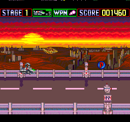 Unlike most other shooters of its time, the story continues with rather involved cutscenes in between each stage. After beating Stage 1, Syd breaks Deva out of jail and learns that he needs to jack in to the police network to delete a virus that has infested the police unit. In these jack-in levels, the bike morphs into a sleek looking spaceship and the action takes place in a abstract looking level to illustrate that Syd is now inside Download. After defeating the threat, Syd returns to the real world and is apprehended by two men-in-black who are just about to make The Big Plot Reveal when a robot kills them and kidnaps Deva. Syd then sets off to rescue her, and they later find clues that make them go to space to jack in to a space station to delete a virus called NERO that is threatening the Earth. There are a few twists and turns to the story, which at the end-of-the-day is a rather traditional sci-fi conspiracy narrative. Its biggest merit however is that it makes the world much more alive than it would have, had it not had the cutscenes.
