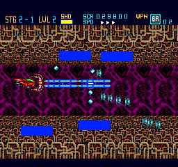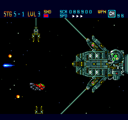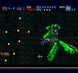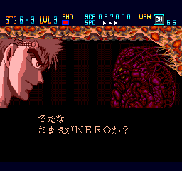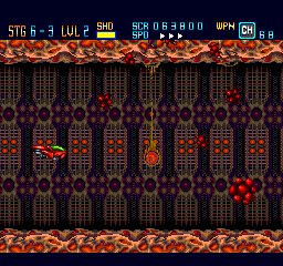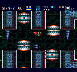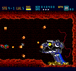 You can select the speed on the fly with the Select button, which is a nice feature (also seen in other PC Engine titles such as Soldier Blade and Gate of Thunder). Most of the time, this is a fast-paced game free from slowdown that is very satisfying to control. There are six stages in total, each with a number of substages. While the number of stages is on the brief side, this game more than compensates for it by its difficulty. The health bar and unlimited continues does make the challenge more fair, but you will probably need to do a good share of memorization to be able to get through the stages and find the best strategy to do so.
