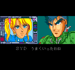 As will soon be evident, the series struggles to keep a coherent style despite the producer (Toshio Tabeta) and executive producer (Makoto Sakio) remaining the same for both games. Masaomi Kanzaki, the artist behind the Street Fighter II and Dragon Quest VI manga adaptations did the character design for the first game, and gave a rather edgy style to the main characters Syd and Deva that works well with the cyberpunk setting. He was for some reason replaced by another manga artist, Shuho Itabashi, for the character design of the second game that was released less than a year after the first one, and their difference in style clearly shows. The second game goes for a more down-to-earth character design, with the effect that everything looks weirdly mundane and more space opera than cyberpunk. For instance, Syd’s head-jack has been replaced by an incredibly dorky-looking helmet, and Deva has been stripped of all her cool and looks more like a concerned mother than a rogue hacker. Throughout the series, Syd uses his motorcycle to connect to Down Load (the bike is called Motoloader – or possibly Motoroader due to the nature of katakana – which is possibly a reference to the PC Engine Motoroader games by Masaiya), but in the second game it has been redesigned to a clunky spaceship instead of a hoverbike. The anime takes it back to the original red bike, thankfully.