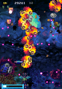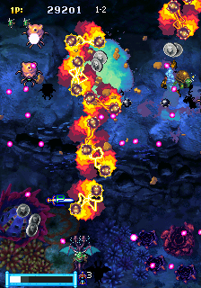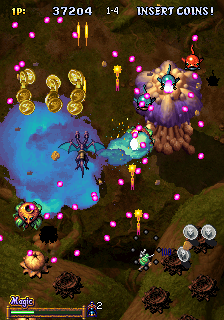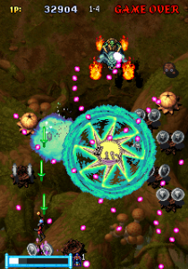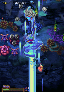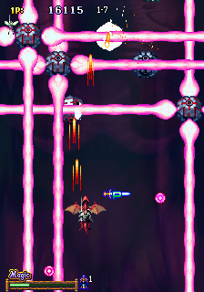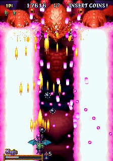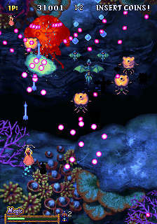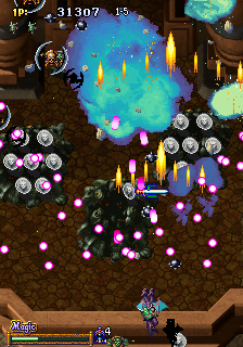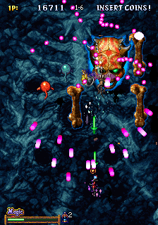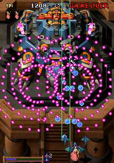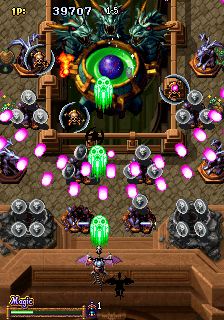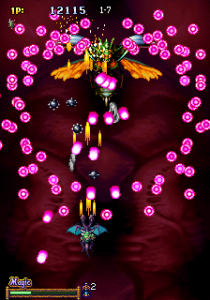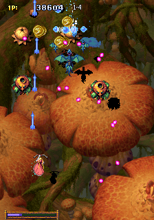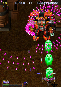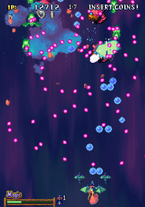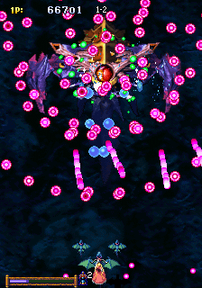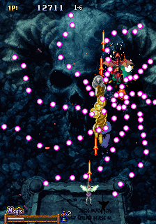The graphics are a little simple, looking very dated compared to other games released in 2000, 2D or otherwise. Still, it’s not a bad looking game.The character and enemy sprites are small, but very detailed and well animated. The backgrounds are inconsistent, with the first stage taking place against a dull green fog, but later areas are nice looking, particularly the beautiful forest full of mushrooms. Hell is one of the better looking levels, with cool looking details like the huge skeletons in the background. The bosses are very animated and have many moving parts, though it can be hard to actually see them behind the curtains of bright pink bullets that they spray off.