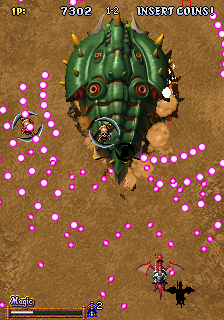 A depressed knight looking for his lost master. He rides a skull dragon and is by far, the most difficult character to use. Every last one of his attacks, from the bomb to any of his magic shots shoot in a straight line. The only thing even close to an attack that shoots in any other direction are homing knives that do not actually home in very well. Luckily, Ian makes up for this flaw with the best speed and respectable power. He also has the funniest ending.