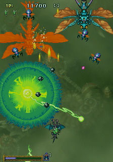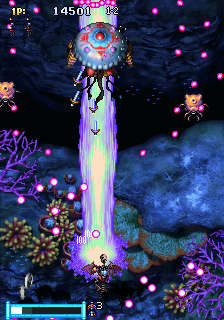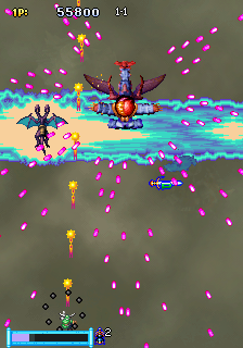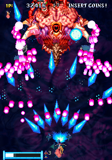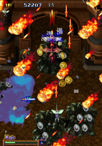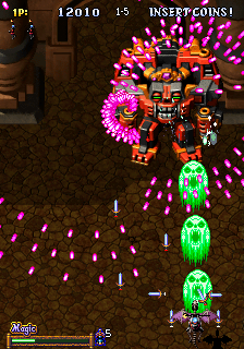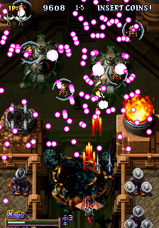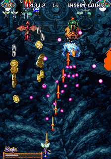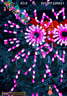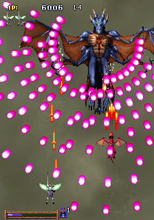 The most interesting feature in Dragon Blaze is the ability to dismount your steed, known as a “dragon shoot”. By pressing the dismount button, the dragon charges forward, ramming any enemies in its way and maintaining his position on the screen, while you continue to control the rider, who has the ability to float. This allows you to shoot from two places on the screen at once, with the rider possessing a weaker weapon than his dragon. Pressing the dismount button again will call the dragon back. It’s similar to concept to the pod from R-Type, but while the dragon is invincible while dismounted, it can’t absorb bullets. Having your dragon blast away at a stationary enemy while dodging the extremely fast bullets is essential to make any sort of progress. There’s also a magic meter, obviously used for magic attacks, which charges as you destroy enemies. These attacks are initiated by holding down the fire button, and change depending on whether your knight is mounted or dismounted. There are also bombs, which are separate from your magic attacks. Like Strikers 1999, there’s also a “technical bonus” obtained when you wait for a boss to reveal their weakpoint, then focusing on it to destroy them quickly.