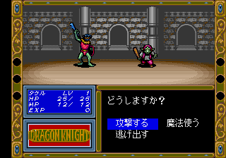The first Dragon Knight is a rather simple dungeon crawler. It only has one town and a six-floor dungeon, so it’s far from being a long RPG, but players were still getting a lot more playtime for their money compared to other erotic games at the time. Takeru is the only playable character, and he can fight against up to six enemies at once. His available actions consist of a physical attack, two magic spells (one for attacking and the other for healing) and running away. The magic attack is mostly useless, due to its high MP cost and low attack power (although it does hit all enemies), and running away has a high probability of failing, so the only viable strategy for every battle in the game is using physical attacks and healing when low on HP. The game balance is also what you’d expect from a 1989 RPG, with grinding being essential during several parts of the game, especially at the very beginning.