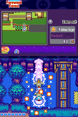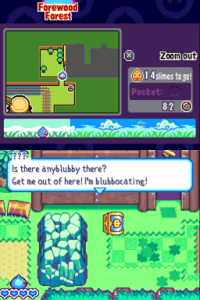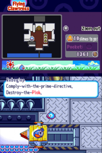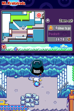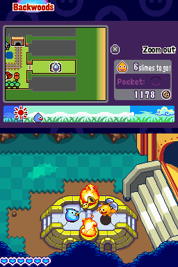 Again, you explore seven different levels in much the same way as the original. Visually, it’s basically identical to its predecessor, though a map is helpfully displayed on the top screen during exploration. Combat feels like a step back from the original, though. Enemies are less aggressive and they rarely do anything interesting to the world around them. New mechanics like bungee cords you bounce between and a controllable robot, are fun, but they’re introduced and thrown out even faster than the original. To make up for this, there’s a much greater focus on collection. It’s much easier to grab things for Rocket to carry and you rarely have to go far to find a way to send something back to town. There’s also an Alchemy Pot, directly imported from Dragon Quest VIII (there’s even a picture of King Trode and his daughter-horse when you find it), which will pump out new items when you put stuff into it.