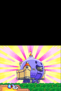 At any rate, that flute wasn’t just some trinket – blowing it will summon the majestic Schleiman tank to duel with other monsters. In each level, there multiple areas where you have to call your tank to fight another foe. In these sections, your tank is positioned on the left side of the battlefield and your opponent’s on right. Despite having treads, both are actually completely stationary. You still control Rocket in these segments, where you pick up stuff and load the ship’s cannons with ammunition to fire at the other side. You also have two friends, chosen among some of the rescued slimes, that work on auto-pilot, that can either continue to fire when you’re not around, or have their AI adjusted for other tactics. Each tank has a low and high cannon that fire in their own arc, and each projectile takes a while to reach the other tank. If a shot in the air hits an opposing shot, both fall to the ground, which means your offense is also how you defend against oncoming attacks.