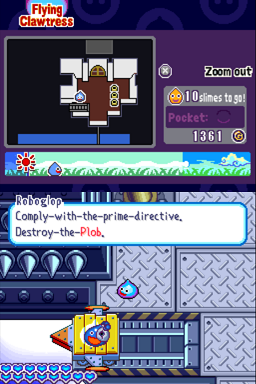 Rocket is also the only game in the Slime Mori Mori series to get an English translation. Localization by Plus Alpha (Dragon Quest IV/V/VII, Phoenix Wright: Trials and Tribulations), the game keeps the modern Dragon Quest tradition of being full of clever and ridiculous puns. Characters have groan-inducing names like the healslime cook Curedon Bleu, the museum-running Crystal Chronicler, or the church leader Mother Glooperior. Each time you face off against a tank you’ll see a name like Fort Knight (who’s listed as “Not Too Weak”) or Chrono Twigger. Considering how grandiose the Dragon Quest games often are, it’s nice to settle down with a smaller scale which has an even greater focus on humor. The end result is an adorably goofy little game.