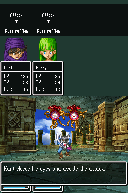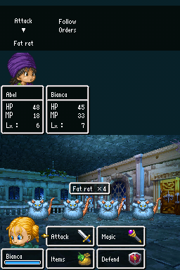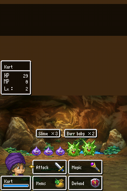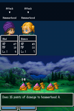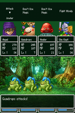 Dragon Quest V was also released for the Nintendo DS, in 2008 in Japan, and in 2009 worldwide, featuring the subtitle “Hand of the Heavenly Bride”. Using the same engine as the DS version of Dragon Quest IV, it features the same enhancements, like fully animated enemies, although many of the assets are the same. Feature-wise, it’s a mix between the SFC and PS2 versions – it includes the four party battles and additional monsters (there are even two new ones) but ditches some of the rendered movies in favor of the original SFC cutscenes, and changed a couple of the dungeons – the Forest of Illusion is back to its SFC version, and the Heaven Tower is just a ruined version of the one featured in Dragon Quest IV. Like Dragon Quest IV for the DS, the environments are more tightly packed, and the battle system is blazingly fast. The music is a midpoint between the two – obviously not as good as the live orchestrations from the PS2 version, but better than the SFC version. Most important is the addition of Deborah, allowing for three different brides. Like Flora, she shows up briefly on the boat at the beginning of the game, but still doesn’t take a great role unless you decide to marry her. There’s also a few new pieces of equipment for her. There’s also another new minigame that uses the touchscreen called Slime Touch.