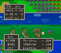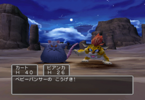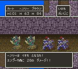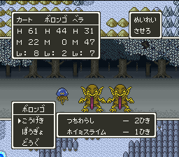 Dragon Quest V also introduces monster taming. As soon as you reach adulthood and purchase a wagon, you can draft enemy monsters to fight in party. There’s no trick to it – just have an open spot in your party lineup, and certain monsters will offer to join after battle, if you’re strong enough. Each has their own unique name (you can meet another Healslime named Hoimin, like Dragon Quest IV) and also level up and gain new abilities as they can experience, just like regular party members. There are a total of forty-two monsters to play as in the Super Famicom version, which is pretty sizable, and this is in addition to all of the other human characters that you can play as (your wife, your kids, and various others.) This system would eventually serve as the basis from the Dragon Quest Monsters spinoff, which was primarily created due to the popularity of Nintendo’s Pokémon series. One of the first creatures you recruit is Saber (named Borongo in Japanese), a young sabretooth cat, who later rejoins the hero when they are both fully grown…after you tame him, anyway.