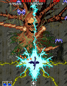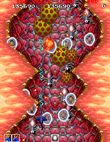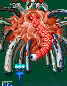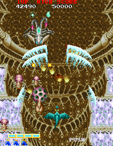 The stages are a bit shorter, although there are still nine levels altogether. In addition to standard prehistoric, volcanic, and glacier stages, there’s an HR Giger-themed level, complete with Alien-like facehuggers that leap out of eggs into the sky; a futuristic castle, complete with gun turrets, pulsing red lights, and laser beams; and a Life Force-style organic level, with creepy blinking eyeballs that emerge from the fleshy surface, and vicious enemy blood cells. In the fact, the influence from Life Force / Salamander is incredibly apparent in the first two bosses – one is a gigantic eye on a stalk, emerges from some kind of brain-like material, the other is a huge fire dragon, both of which resemble the first and third bosses respectively from Konami’s classic shooter. Much like Dragon Spirit, there are nine stages, so it’s a fairly long game. However, there’s an invisible time limit against the last boss – if you take too long, it’ll escape and you’ll lose the entire game, without so much as a “bad ending” cinema.
