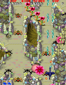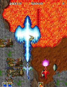 New to Dragon Saber is a two player simultaneous mode – the dragons you control are Huey and Siria, and there’s a similar transformation sequence when you first start. Your dragons are now also equipped with a power shot, which charges up automatically as long as you’re not firing. You can also hold down the fire button for a rapid shot. Your fire power can also be upgraded with a single red orb, instead of three. There are several new transformations, including an ice dragon, a lightning dragon, a fire dragon, and a steel dragon, each with their own unique (and powerful) charge shots. The arcade game allows for a maximum of five hit points (three in the PC Engine version), but it’s doubtful any arcade operator set it that high, as you can only take a single hit on the default setting. Dragon Saber still uses checkpoints, but you’ll resurrect instantly if you’re playing with a partner, so it’s a little easier in that sense. In general, the game isn’t quite as rough as Dragon Spirit, but it’s still plenty challenging.