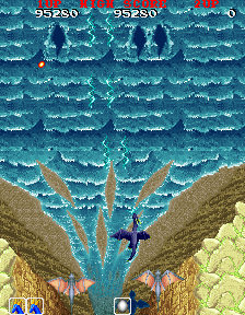 Released two years later, Dragon Saber: After Story of Dragon Spirit improves on nearly every aspect of the original. The setting has been changed from a mythical one to a futuristic one, and the graphics are subtly better, making sparse use of scaling and rotation effects (one level begins as your dragon descends into a canyon – very cool), although not as much as Phelios, another shooter that also runs on the Namco System 2 board. The music is just as catchy, if not better. Namco was even kind enough to include arrangements of several themes from Dragon Spirit, which are accessible through a code. It was also composed by Shinji Hosoe, and some of its music appears in Taiko no Tatsujin 9 (one of the many Japanese releases of Taiko Drum Master.)