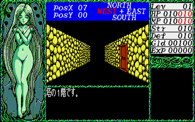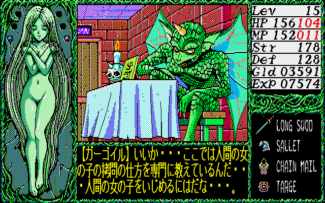 In a time where most erotic games still didn't look very good, Dragon Knight was one of the few that featured high quality anime style art and competent CG work. It only uses 8 colors, so some of it is quite impressive for the limited palette. Not to mention the music, which was also better than what most players were used to in eroge, and the effort that went into making the soundtrack is apparent. Each floor of the tower has its own theme, and the later half of the game even uses a different normal battle theme. While all of the computer versions released in 1989 look and play mostly the same, the music in the X68000 version sounds best, thanks to the OPM sound chip.