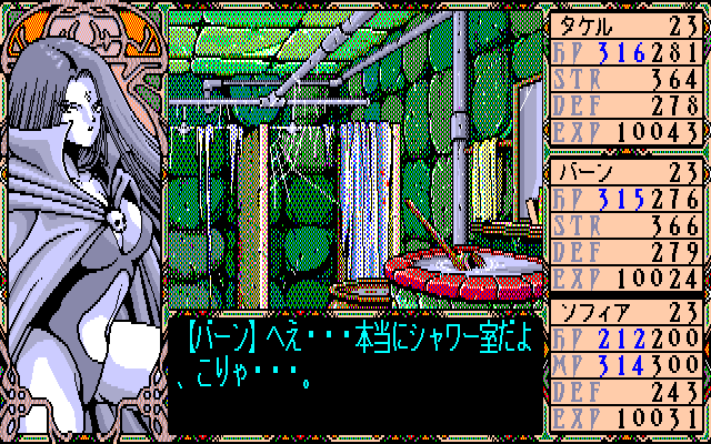 Perhaps feeling that the battle systems in the previous games weren't very good, Elf decided to try an auto-battle system for the third game. The party still has three characters, with Luna, the main heroine from the first game, taking Sophia's place as the magic user. When a battle starts, Takeru and Baan automatically attack and will do so until they kill the enemies or die, but with Luna in the party, the player is given the option to use one of the four available magic spells. Luna has a MP bar that auto-regenerates when time passes, and once a spell is used, the entire bar is depleted and the effects of the spell used are influenced by how much of the bar was filled when it was used. But, as was the case in the other games, the only actually useful magic is the healing spell. In fact, it effectively breaks the game, as the MP bar fills faster than the HP bars deplete. As long as the characters aren't way underleveled, it's practically impossible to die in the game after Luna joins the party, bar the player forgetting to heal when needed. In a way, it's surprising Elf managed to make the battle system even less interesting than it already was.