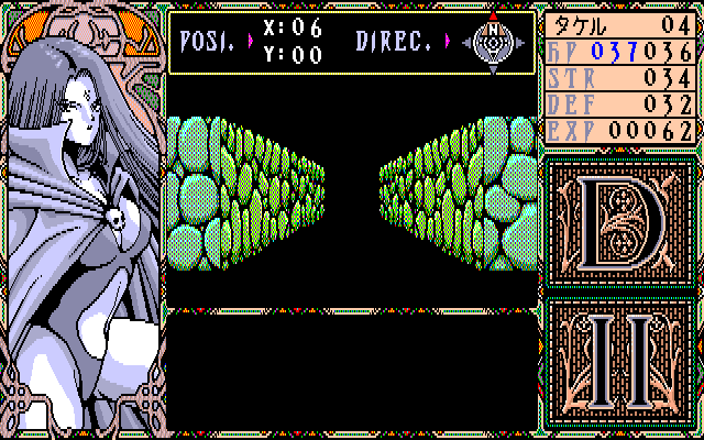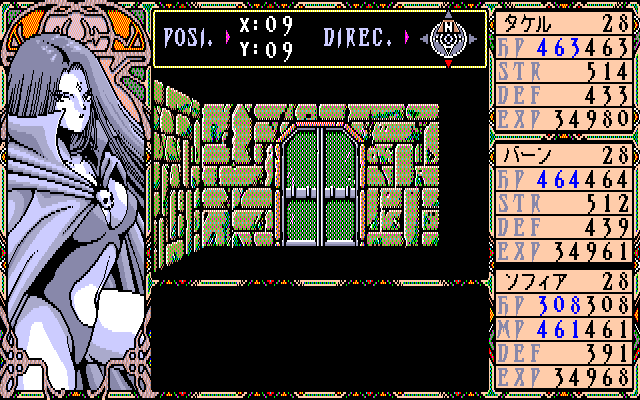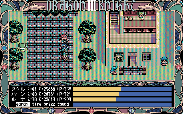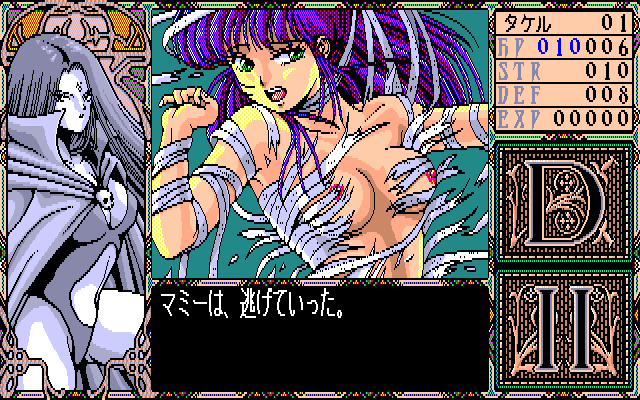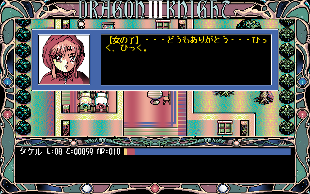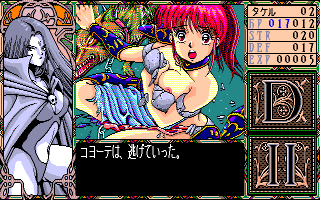 Despite being the conclusion to Takeru's story, Dragon Knight III's plot doesn't have a lot going for it. The bigger scale of the world is never put to good use, and most of the towns you visit and new characters you meet are irrelevant to the main story, only serving to provide completely random sex scenes, an odd amount of which have a weird Grimm's fairy tale theme going. Other than two or three scenes during the main portion of the game, most of the actual plot is contained in the final dungeon, which makes one wonder if completely changing the game system was really necessary, especially when the execution was so poor. At least the visuals still maintain the same level, and there's some nice effort put into the battle sprites, as each character's look changes depending on what they have equipped, which wasn't all that common at the time. The music still sounds nice too, and the field and battle themes are some of the best in the series.