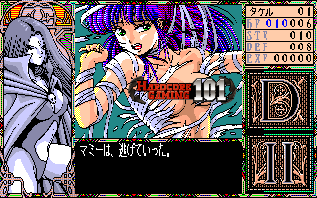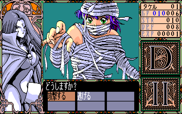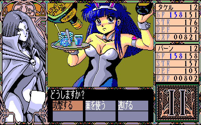 Just like they did with Dragon Knight II before, NEC Avenue released their own version in 1994 for the PC Engine. Knowing that the battle system hadn't been well received, they decided to return to a turn-based system with a first-person view. This time you can give commands to each of the three characters individually, and Takeru even has some special attacks and his own MP bar. This makes for the best battle system between the first three games, and definitely an improvement over the original. The staff probably felt that part of the success of the previous game was due to the monster girls, so they decided to change most enemies to monster girls in this version, even though it didn't make any sense in the plot. The sprites used in battle are all fully animated and therefore battles are more visually engaging. The field sprites are also a bit taller and better looking, but not enough to make much of a difference. There are some CDDA tracks in the PC Engine version, and they all sound better than their PC counterparts. Unfortunately though, the best tracks are all in PCM audio. But despite the improvements, it still remains a weak game, and there's not a lot anyone could do about it other than completely remaking it from scratch.