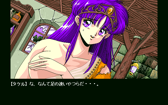 For Takeru's third and final adventure, Elf decided to change the game system to something completely different from the previous games. This time around, Takeru is controlled from an overhead view, akin to classic console RPGs like Dragon Quest and Final Fantasy, and there's a world map with various towns to visit and explore, including the two towns from the previous games. But unfortunately, it ended up being an uninteresting world. Every town looks mostly the same and there's no real fun to be had in exploring. Most of the game is just spent traveling from town to town in a linear way and without any meaningful deviations, as the only optional stuff available is some few extra sex scenes. Throughout the whole game there's also only one dungeon with an actual puzzle, which involves getting part of the solution from two different NPCs (which can only be done by saving and reloading, as each NPC won't tell you his part of the solution if you've talked to the other NPC first) or finding the whole solution based on a hint from another NPC. Other than that, the dungeons' layouts are all boring and mostly straightforward, a huge contrast to the mazes in the first two games. Overall it's a change for the worse, and the staff clearly wasn't ready to take on a RPG with a big world to explore.