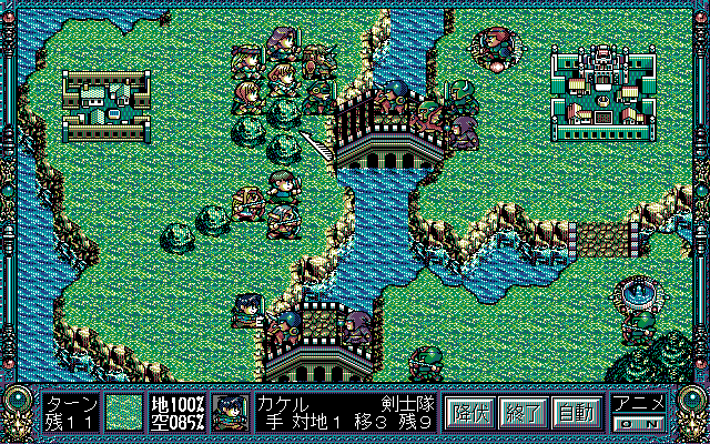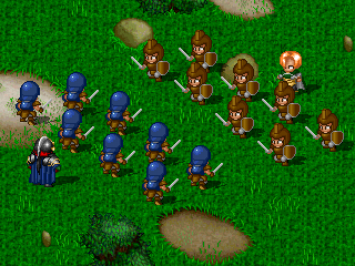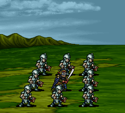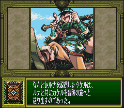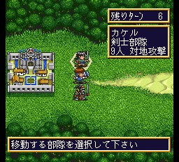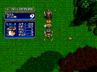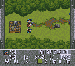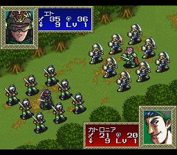 The Super Famicom version tries to be faithful to the original for the most part, other than changing one part of the journey due to censoring. The battle maps and system are mostly unchanged, but it adds experience points and a level-up system. Exclusive to this version is the resurrection seed, an item that lets you revive one of your dead characters, which makes it the easiest version of the game. Banpresto also added a new recruitable character, Wendy, and the new enemy characters Ridya, Hadess and Beirit. Due to the Super Famicom limitations, it removes a good part of the art from the original, and what remains is displayed at a much lower resolution. To compensate, the towns probably look the best in this version, with some good quality sprite work and a more visually pleasing color palette than any other version.