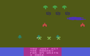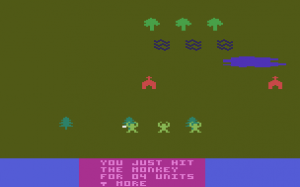 You can also spend your money at churches for the chance of being healed, which happens so infrequently that it’s almost a total waste of gold. You can also pray, which has the game print out “NO EFFECT”, the same thing you get if you don’t get healing. You have to wonder if the programmer was trying to imply something with that. You can also regain strength naturally over time, although this is so slow that you’ll probably be attacked more than once before you get any appreciable amount of strength back. It doesn’t matter if you’re standing still or moving, if monkeys want you dead, they will find you. Really, the best thing you can do is get the identification scroll and go to the village as soon as you possibly can. This is not a game for those who love to grind, since just a couple of bad enemy encounters can easily kill you. At the very least, dying in the overworld isn’t much of a punishment, since it just respawns you where you died, without all your items, but resetting you back to your initial amount of 400 pieces of gold.